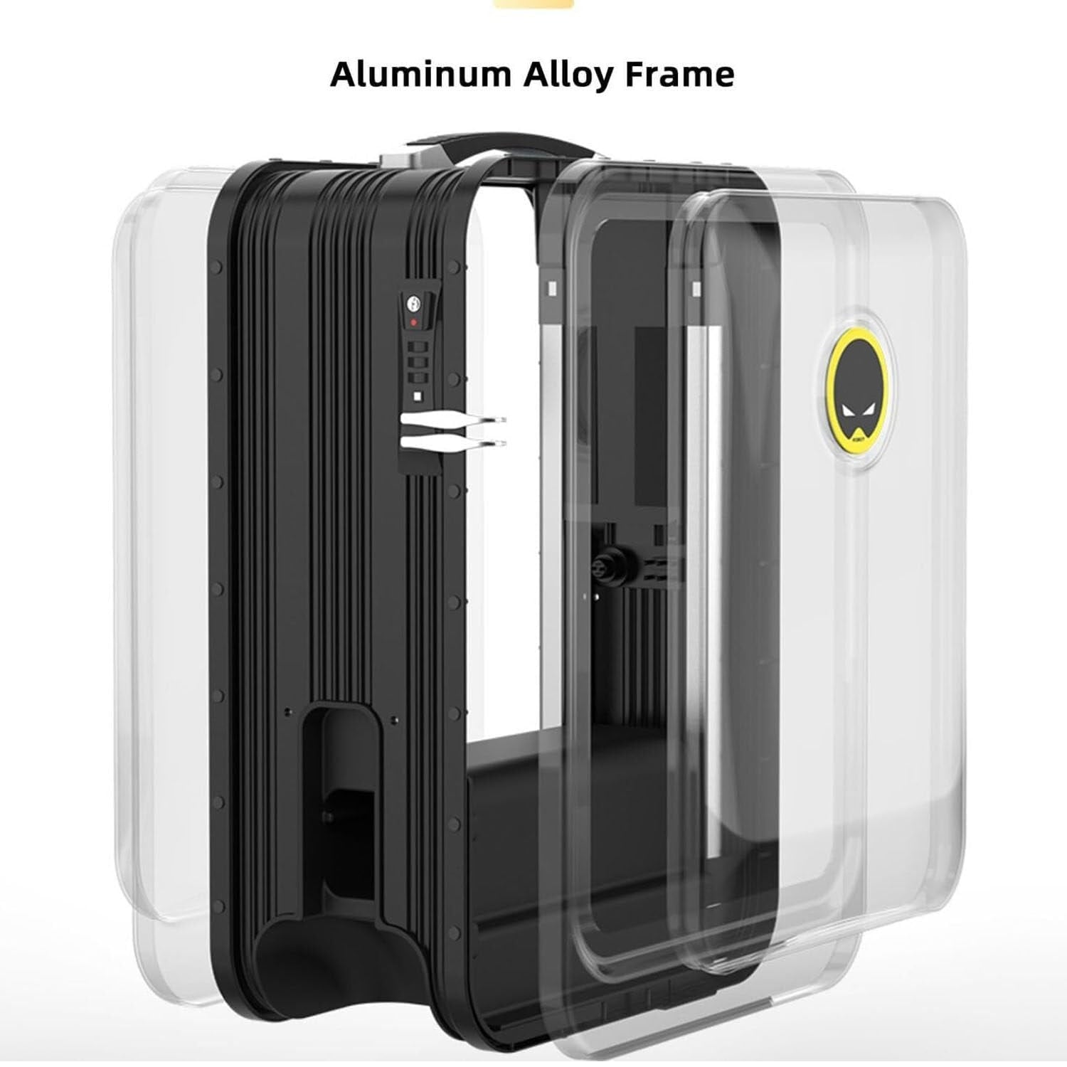 DURABLE CONSTRUCTION WITH TSA-APPROVED LOCK: You can be sure that your belongings are safe with this tough aluminium ride on suitcase. The shell of the electric suitcase is made with aviation-grade aluminium coated with a protective PC film, and the rest of the rideable suitcase is crafted with high-quality ABS material for added strength and durability! With secure TSA-approved locks, you can rest easy knowing that your aluminium carry on luggage will pass through customs without any issues.